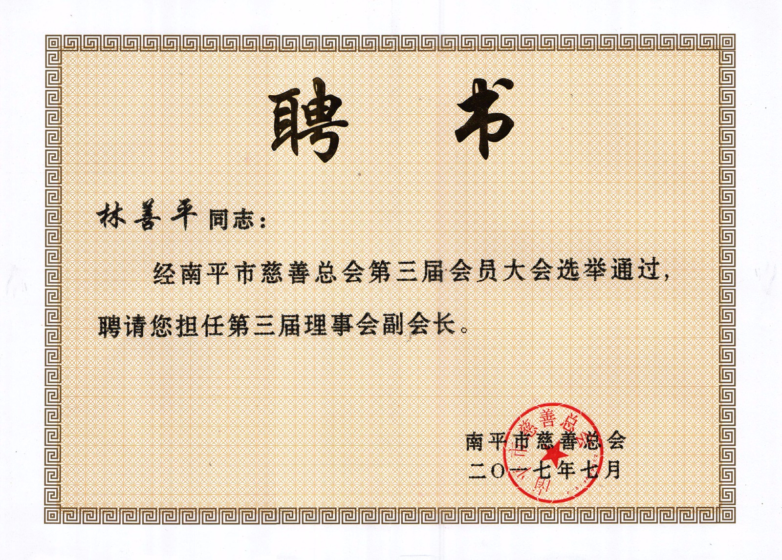 虹潤公司董事長林善平連續三屆當選為南平市慈善總會副會長